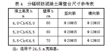 平原區(qū)填土高度h≤6.5 m的小橋,可采用薄壁臺(tái),軟基段宜控制在6.0 m以下。現(xiàn)運(yùn)營(yíng)的高速路中有些薄壁臺(tái)出現(xiàn)開(kāi)裂現(xiàn)象,設(shè)計(jì)時(shí)應(yīng)特別引起注意。
