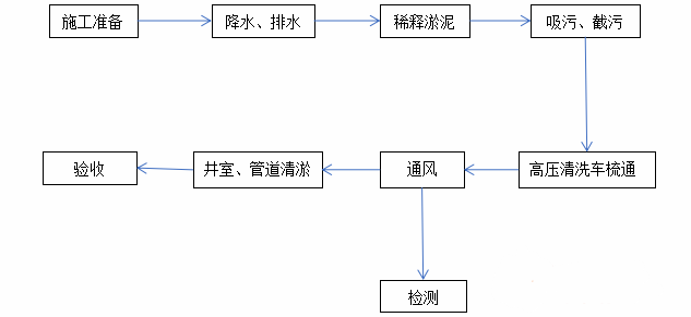使用泥漿泵將檢查井內污水排出至井底淤泥。將需要疏通的管線進行分段,分段的辦法。根據管徑與長度分配,相同管徑兩檢查井之間為一段。