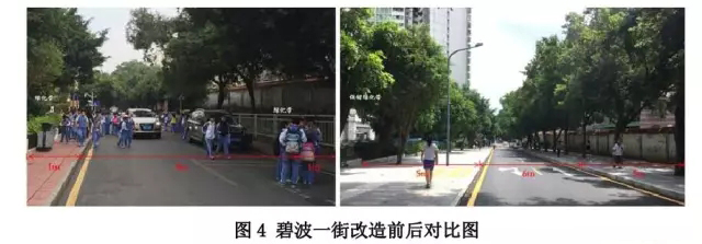 ● 碧波一街:原雙向2 車道機(jī)動(dòng)車道寬度從8 米壓縮為6 米,利用兩側(cè)消極的綠化帶,將兩側(cè)人行道寬度從1 米加寬到5 米。