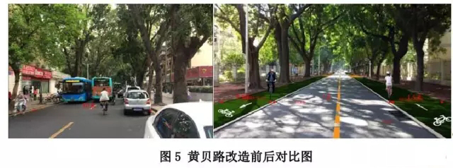 ● 黃貝路:原10 米機(jī)動(dòng)車道壓縮為7 米,在兩側(cè)各設(shè)置1.5 米寬自行車道,解決自行車出行和地鐵接駁需要。