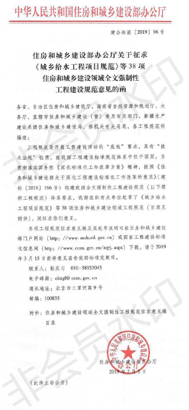 日前,住房和城鄉(xiāng)建設(shè)部辦公廳發(fā)布《關(guān)于征求<城鄉(xiāng)給水工程項(xiàng)目規(guī)范>等38項(xiàng)住房和城鄉(xiāng)建設(shè)領(lǐng)域全文強(qiáng)制性工程建設(shè)規(guī)范意見的函》,公布了《建筑和市政工程防水通用規(guī)范》征求意見稿。