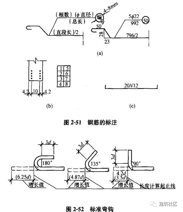 (5)鋼筋末端的標(biāo)準(zhǔn)彎鉤可分為90°, 135°, 180°三種(圖2-52)。當(dāng)采用標(biāo)準(zhǔn)彎鉤時(shí)(標(biāo)準(zhǔn)彎鉤即最小彎鉤),鋼筋直段長(zhǎng)的標(biāo)注可直接注于鋼筋的側(cè)面(圖2-52)。