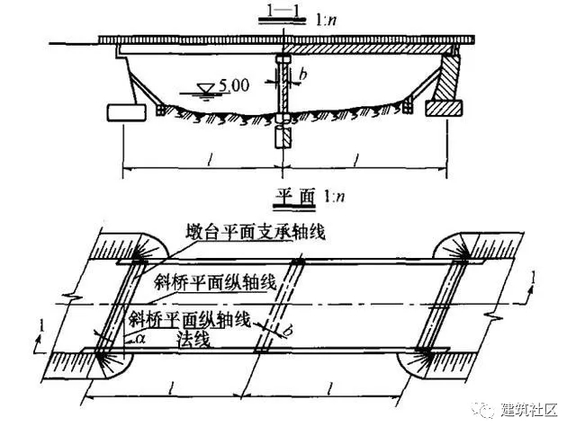 4)斜橋傾斜角a,應(yīng)采用斜橋平面縱軸線的法線與墩臺(tái)平面支承軸線的夾角標(biāo)注(圖2-64)。