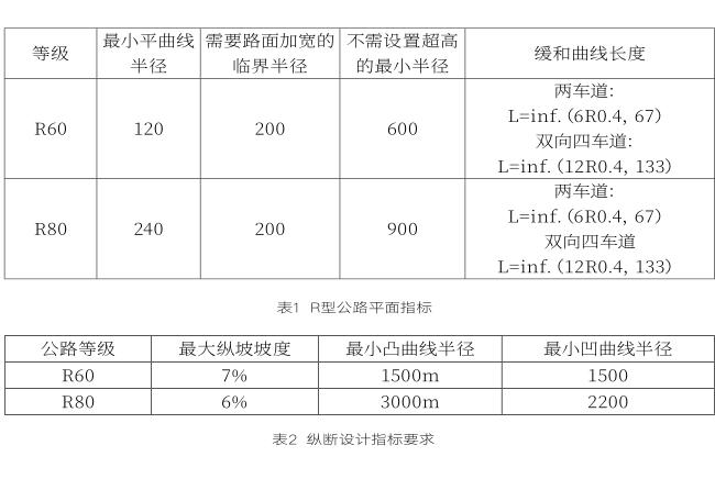R型公路主要分為R60和R80兩個等級,其主要平面指標見表1。
