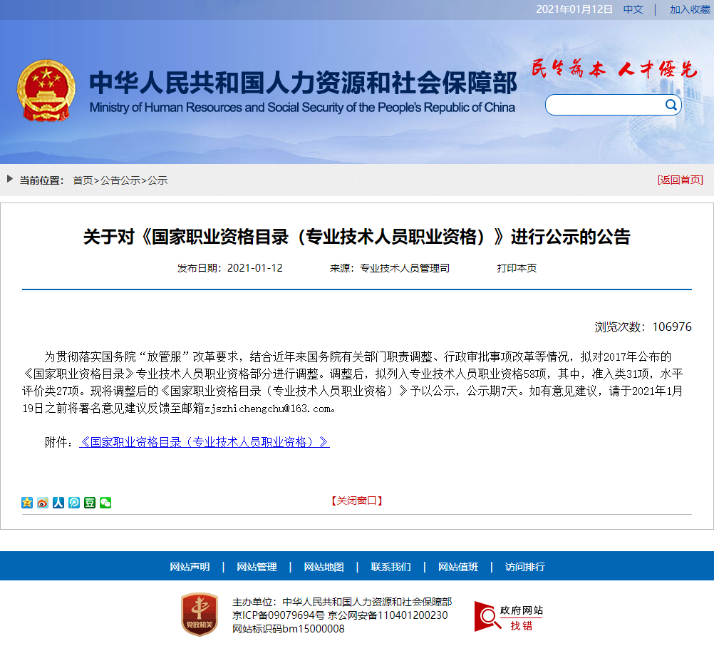 為貫徹落實國務院“放管服”改革要求,結合近年來國務院有關部門職責調整、行政審批事項改革等情況,擬對2017年公布的《國家職業資格目錄》專業技術人員職業資格部分進行調整。調整后,擬列入專業技術人員職業資格58項,其中,準入類31項,水平評價類27項?,F將調整后的《國家職業資格目錄(專業技術人員職業資格)》予以公示,公示期7天。如有意見建議,請于2021年1月19日之前將署名意見建議反饋至郵箱zjszhichengchu@163.com。
