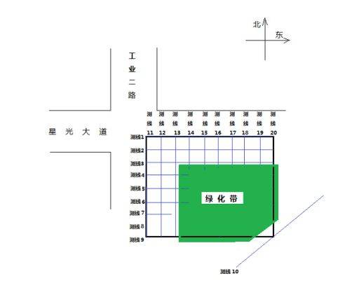 以工業(yè)二路與星光大道路口處左幅41#墩位為例,按業(yè)主要求及場地實際情況,本次勘察共布置測線20條,對被測區(qū)域進行網(wǎng)格劃分,測區(qū)內(nèi)管線測線布置如下圖所示。(其它各墩位測線以此類推)