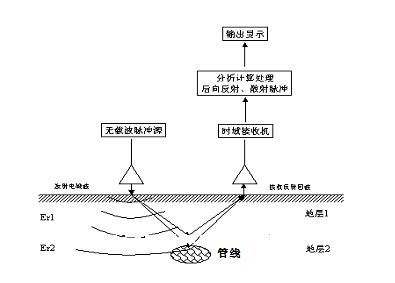 地質(zhì)雷達探測地下空洞是利用空洞與土層的電性差異來實現(xiàn)的。由于路面、土層、空洞、管線是不同的材料構(gòu)成,不同材質(zhì)間的接觸面及同一種材質(zhì)內(nèi)部不連續(xù)面都是良好的雷達波反射界面(即管線、空洞與土層接觸面、路面與土層的分界面等)。當(dāng)雷達波向下傳播經(jīng)過這些界面時,都會發(fā)生不同程度的反射、折射和散射,產(chǎn)生不同程度的波能吸收和衰減,集中反映在波形和波阻特征變化上。分析研究接收回波的特征差異,就可以揭示路面地下管線特征。