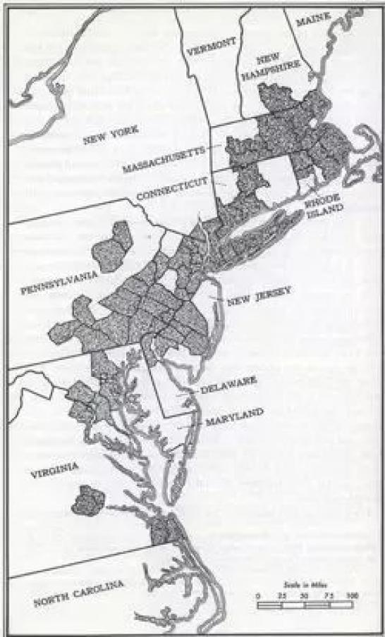 如今,規劃人員越來越多地談論與交通、經濟和環境有關的問題,而在規模上脫離了社區和城市,整個地區被多個地鐵連接在一起。不過,“大都市圈”的概念并不新鮮。這張1961年吉恩·戈特曼所著《大都市》一書中的地圖,展示了華盛頓特區東北部到波士頓一個連綿不斷的超大區。