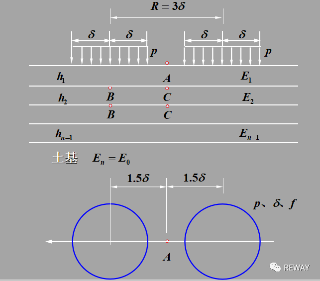 層底拉應(yīng)力以單圓中心 (B點(diǎn))及雙圓輪隙中心 (C點(diǎn))為計(jì)算點(diǎn),并取較大值作為層底拉應(yīng)力。按式(8.0.13)計(jì)算層底最大拉應(yīng)力: