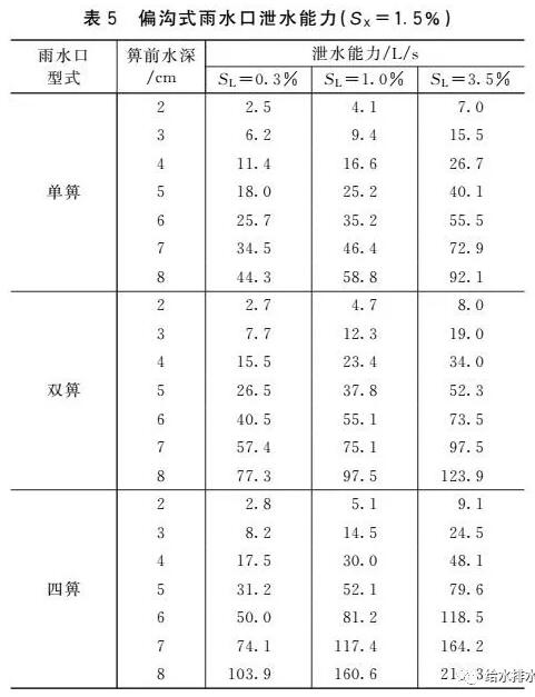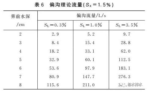 (1)雨水口泄水能力不應超過其偏溝流量,而我國標準圖集泄水能力推薦值卻超過了偏溝流量。對于箅前水深、道路橫坡和縱坡一定的偏溝式雨水口,其偏溝流量是固定的(見表6)。對于箅前水深4 cm的偏溝式雨水口,偏溝式雨水口泄水能力不應大于18.2 L/s(SL=0.3%)、33.1 L/s(SL=1.0%)、62.0 L/s(SL=3.5%),這和箅子數量無關。