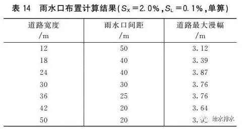 道路坡度調整表14為道路縱坡為0.1%時的雨水口最小布置間距(滿足表13漫幅要求)。