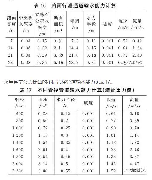 采用曼寧公式計算的路面行泄通道輸水能力見表16(假設機動車和非機動車道寬度均為3.5 m)。