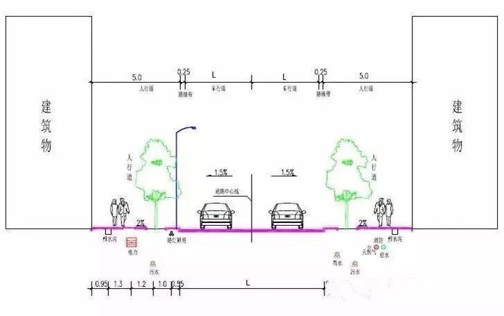 1、沒有具體平面尺寸,只有局部斷面圖,確定各個管道平行向的間距,但往往與景觀道路、綠化相矛盾;