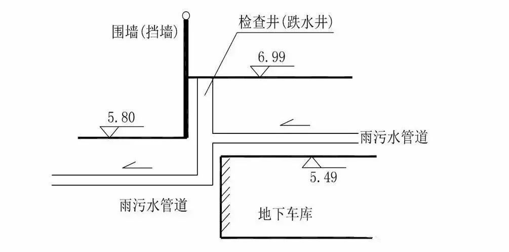 針對項目地下管線需跨越地庫、小區(qū)環(huán)路、市政道路3個標(biāo)高,小區(qū)雨污水管無法直接排入市政管網(wǎng),設(shè)計上選用跌水井,如圖。