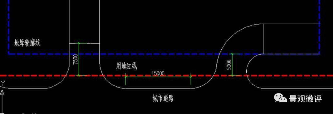 3)機(jī)動車停車庫的出入口的坡道終點(diǎn)面向城市道路時,其與城市道路紅線的距離不應(yīng)小于7.5m,平行城市道路或與城市道路斜交角度小于75度時應(yīng)后退基地的出入口不小于5.0m