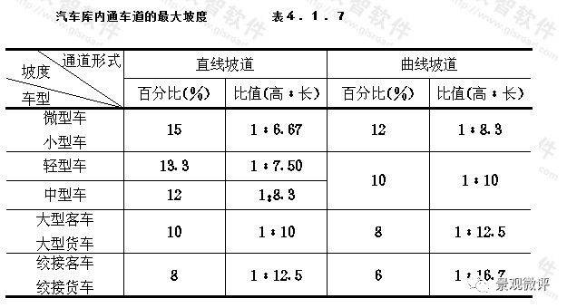 汽車庫內(nèi)當(dāng)通車道縱向坡度大于10%時,坡道上、下端均應(yīng)設(shè)緩坡。其直線緩坡段的水平長度不應(yīng)小于3.6m,緩坡坡度應(yīng)為坡道坡度的1/2。曲線緩坡段的水平長度不應(yīng)小于2.4m,曲線的半徑不應(yīng)小于20m,緩坡段的中點(diǎn)為坡道原起點(diǎn)或止點(diǎn)。