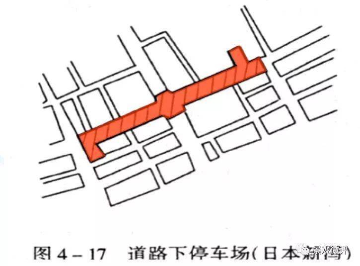 曲線形坡道占地面積小,適用于狹窄地段,視線效果差,進(jìn)出不太方便,圖4-36(d)、(e)