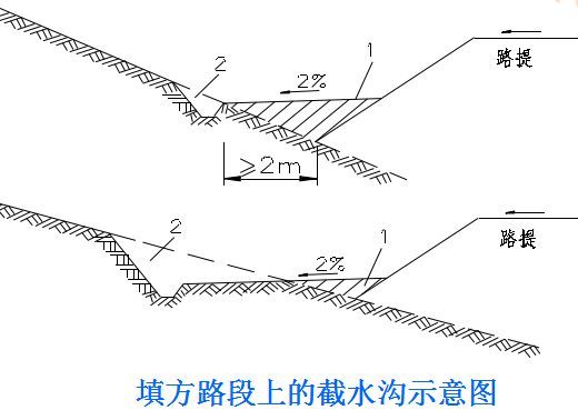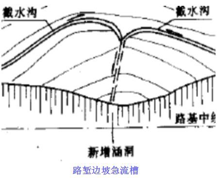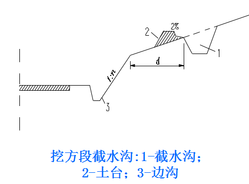 2.截水溝:又稱天溝,一般設置在挖方路基邊坡坡頂以外,或山坡路堤上方的適當地點,用以攔截并排除路基上方流向路基的地面徑流。