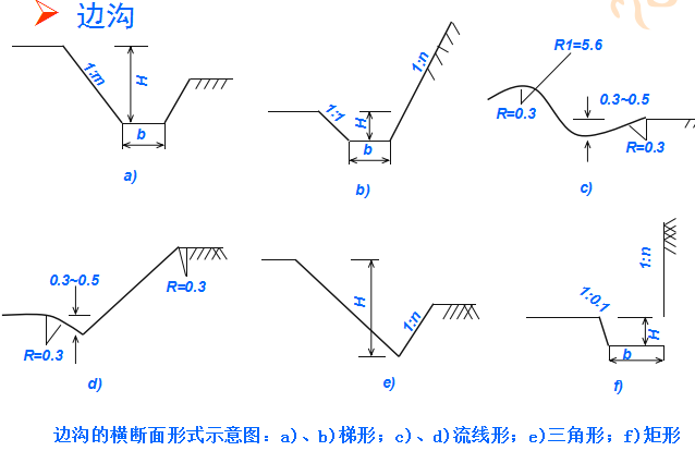 ①排水溝的橫斷面一般采用梯形,尺寸大小應經過水力水文計算選定;