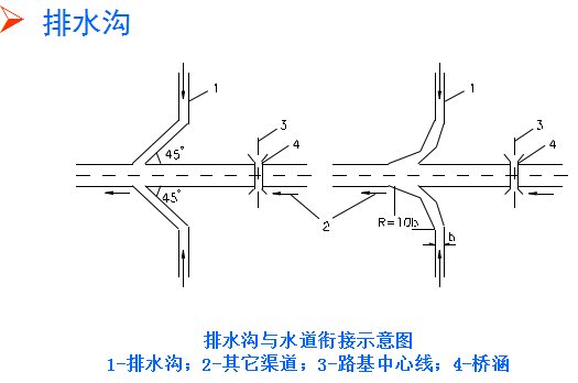 (3)排水溝水流注入其他溝渠或水道時,應使原水道不產生沖刷或淤積。通常應使排水溝與原水道兩者成銳角相交,交角不大于45?,有條件可用半徑R=10b(b為溝頂寬)的圓曲線朝下游與其它水道相接。