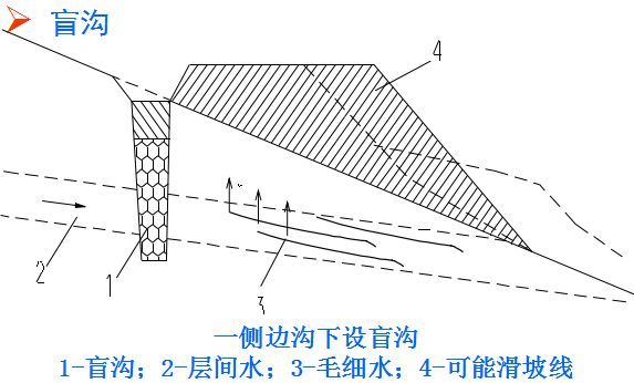 7.盲溝:相對于地面排水的明溝而言,盲溝又稱為暗溝,是一種隱蔽工程。在溝內填以大小不同的顆粒材料,利用滲水材料的透水性將地下水匯集與溝內,并沿溝排泄至指定地點。