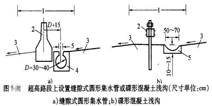 (1)寬度小于3m且表面采用鋪面封閉的中央分隔帶排水,降落在分隔帶上的表面水排向兩側行車道,其坡度與路面的橫坡度相同;在超高路段上,可在分隔帶上側邊緣處設置緣石或泄水口,或者在分隔帶內設置縫隙式圓形集水管或碟形混凝土淺溝和泄水口,以攔截和排泄上側半幅路面的表面水。緣石過水斷面的泄水口可采用開口式,格柵式或組合式;碟形混凝土淺溝的泄水口采用格柵式。