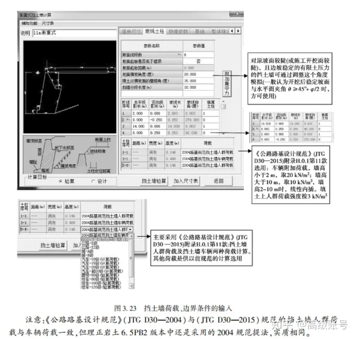 在實際設(shè)計工作中也常用理正軟件來進行設(shè)計或驗算。理正擋墻中內(nèi)置了多種計算車輛荷載的方法,其中采用“2004路基規(guī)范擋土墻車輛車載”這一選擇,即是跟現(xiàn)行規(guī)范的規(guī)定一致,換算土柱高度是根據(jù)我們輸入的墻高和填土容重自動計算的。所以個人認為直接選這一項就可以了。