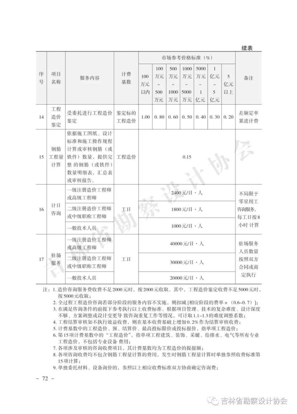 為貫徹落實(shí)省住建廳《關(guān)于推進(jìn)勘察設(shè)計(jì)行業(yè)高質(zhì)量發(fā)展的指導(dǎo)意見(jiàn)》(吉建辦〔2022〕66號(hào))文件精神,加強(qiáng)行業(yè)自律,維護(hù)健康市場(chǎng)秩序,打造公平有序的競(jìng)爭(zhēng)環(huán)境,在業(yè)務(wù)主管部門(mén)的指導(dǎo)下,協(xié)會(huì)組織相關(guān)專(zhuān)家,依據(jù)住建部《關(guān)于推進(jìn)建筑業(yè)發(fā)展和改革的若干意見(jiàn)》(建市〔2014〕92號(hào))、發(fā)改委《關(guān)于進(jìn)一步放開(kāi)建設(shè)項(xiàng)目專(zhuān)業(yè)服務(wù)價(jià)格的通知》(發(fā)改價(jià)格〔2015〕299號(hào))和《工程勘察設(shè)計(jì)收費(fèi)標(biāo)準(zhǔn)》(計(jì)價(jià)格〔2002〕10號(hào))等文件,對(duì)《吉林省建筑工程勘察設(shè)計(jì)收費(fèi)指導(dǎo)價(jià)(試行)》(吉勘設(shè)協(xié)字〔2016〕10號(hào))予以修編,形成《吉林省工程勘察設(shè)計(jì)收費(fèi)導(dǎo)則(2022版)》,現(xiàn)印發(fā)給你們,請(qǐng)參照?qǐng)?zhí)行。
