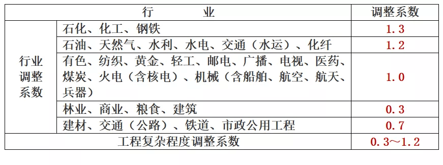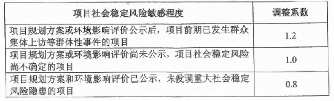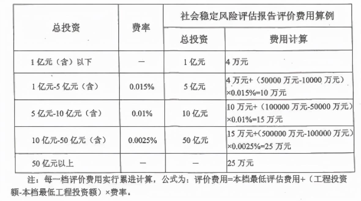 上述兩份文件給出“編制建設項目社會穩定風險評估報告的基準收費標準”、“評價建設項目社會穩定風險評估報告的基準收費標準”和三種“分檔收費調整系數”,其中: