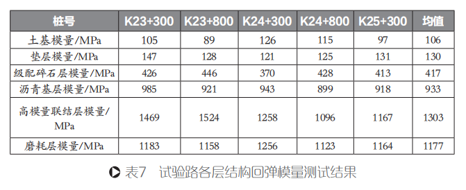 根據(jù)《公路路基路面現(xiàn)場(chǎng)測(cè)試規(guī)程》(JTG E60-2008),對(duì)試驗(yàn)路各層施工完成后進(jìn)行現(xiàn)場(chǎng)回彈模量試驗(yàn),其測(cè)試結(jié)果如表7所示。
