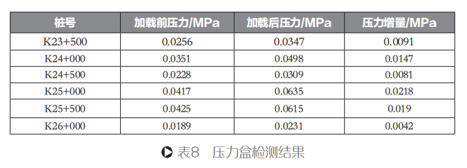 為測(cè)量長(zhǎng)壽命瀝青路面試驗(yàn)路段土基頂面所受壓力,根據(jù)《公路路基路面現(xiàn)場(chǎng)測(cè)試規(guī)程》(JTG E60-2008)要求,在試驗(yàn)路行車(chē)道上埋置壓力盒,測(cè)取在10t軸載單輪下的壓力值,具體檢測(cè)結(jié)果如表8所示。