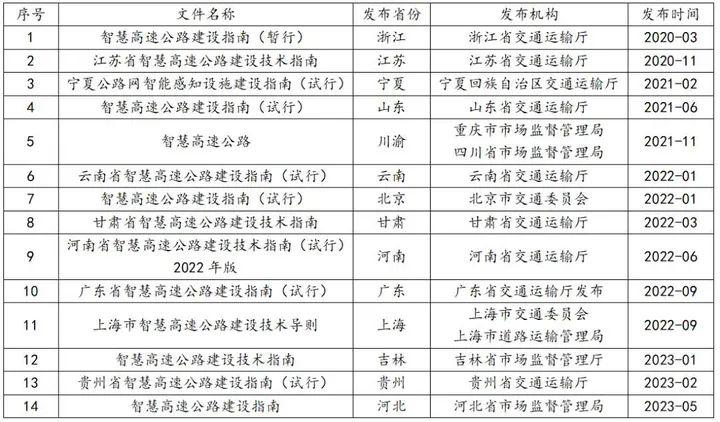 截止目前,全國共有14個省市,發(fā)布了智慧公路建設(技術)的指南文件。各省發(fā)布時間及文件名稱如表1所示。