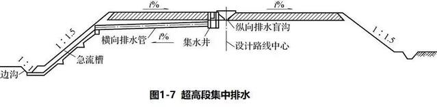 對于新建高速公路超高段的集中排水,宜采用在左側(cè)路緣帶的左側(cè)設(shè)置帶有鋼筋混凝土蓋板的預(yù)制整體式U形混凝土溝或縫隙式排水溝,每25~50 m設(shè)一處集水井,并通過橫向排水管引至邊坡的急流槽或暗管中,如圖1-7所示。