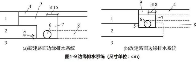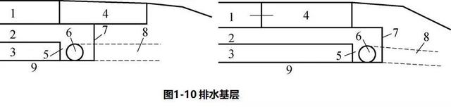 1)路面邊緣排水系統(tǒng)由縱向排水管、橫向出水管、集水溝和反濾織物(土工布)等組成,如圖1-9所示。