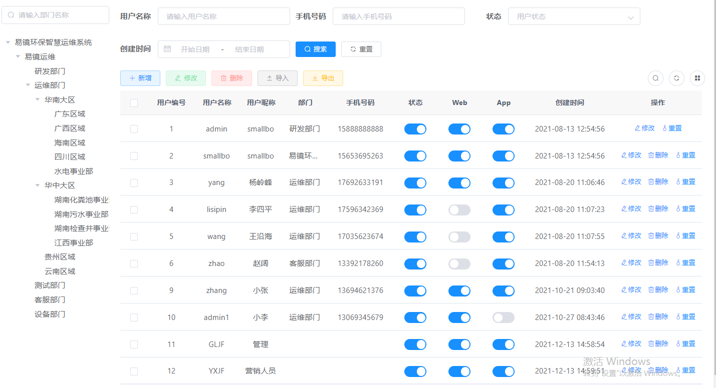 管理員可以通過用戶模塊管理各個部門的用戶,添加用戶角色,并設置權限和數據權限。還可進行部門管理。